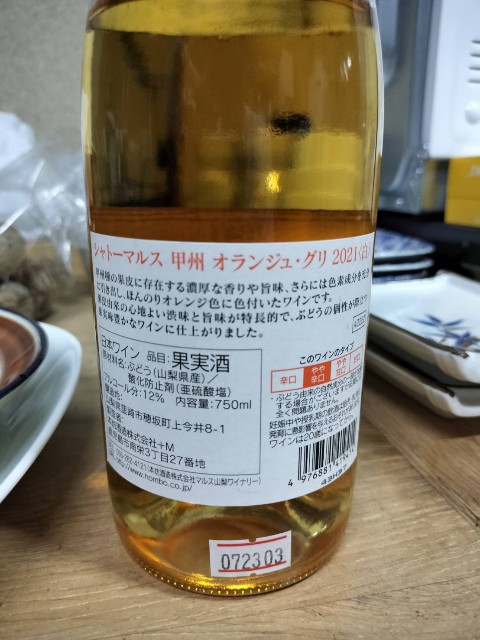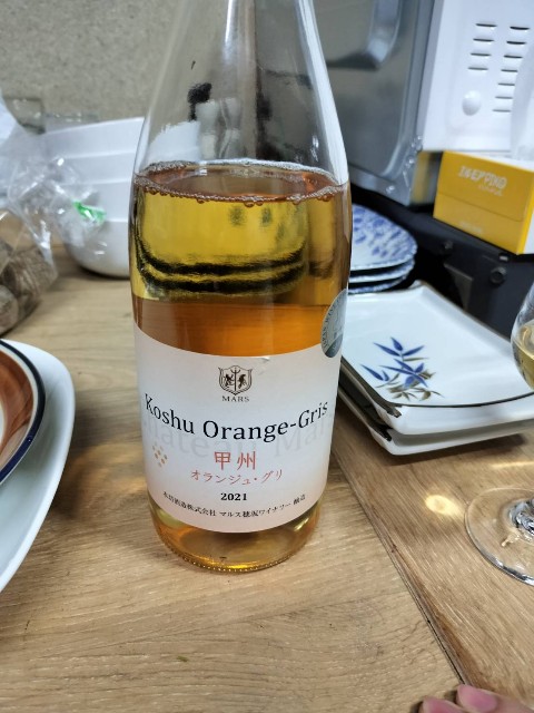 2023-04-08 【山梨】シャトーマルス 甲州オランジュグリ2020 日本ワイン シャトーマルス(ブランド) 甲州(品種) 約1900円本坊酒造が山梨で設立したワイナリー また白ぶどうを使って赤ワインの製法を用いているので、オレンジワインと呼ばれるものです香りは穏やかでしたが、みかんのような甘酸っぱい感じです 渋みなども穏やかなので、初心者向き